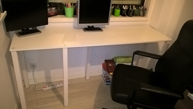 O resultado foi o pretendido: conseguimos ocupar o espaço vazio com duas secretárias. Uma ficará para o Gabriel e a outra para nós os dois e para os computadores. Isto de ter um informático em casa tem destas coisas...